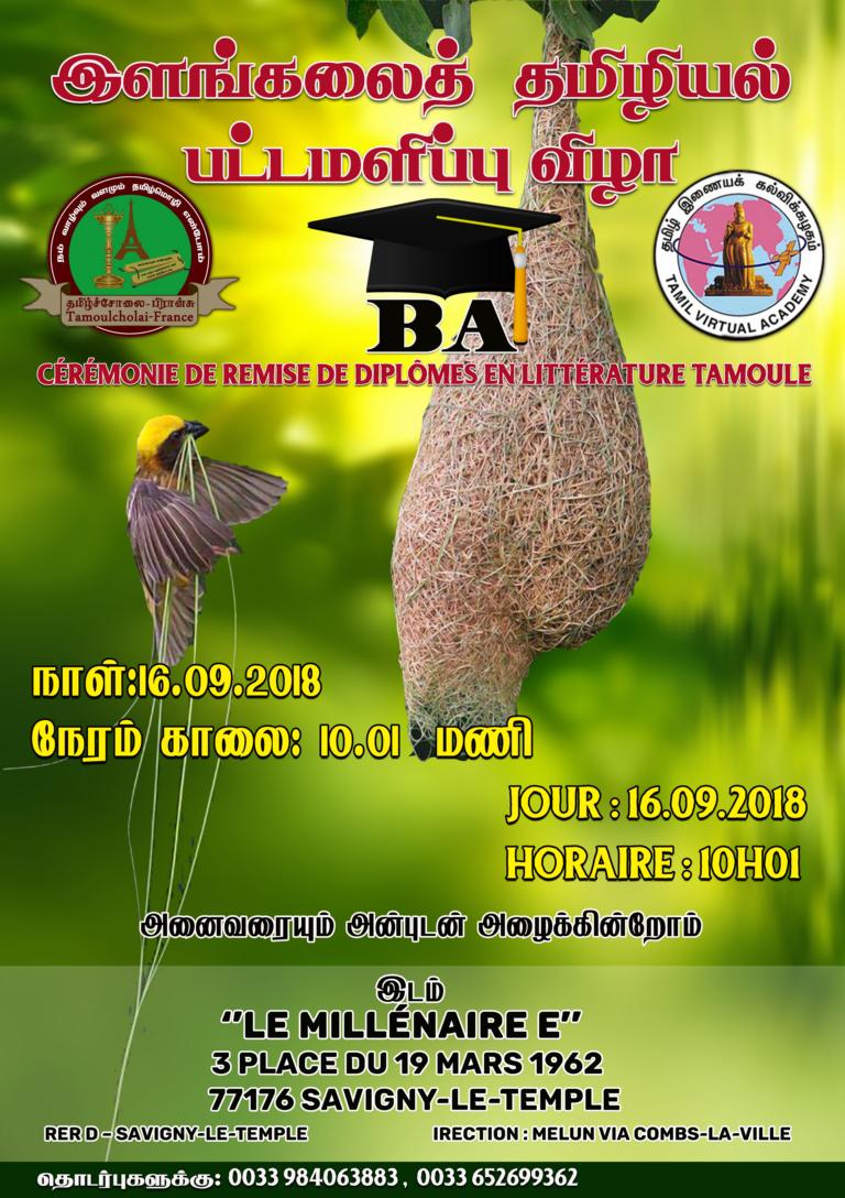 தமிழியல் இளங்கலைமாணி (B.A ) முதலாவது பட்டமளிப்பு விழாவிற்கான ஏற்பாடுகளை, பிரான்சு தமிழ்ச்சோலைத் தலைமைப் பணியகம் மேற்கொண்டு வருகிறது.