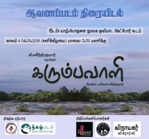 உடுப்பிட்டிப் பகுதியில் இருநூறு வருடங்களுக்கு முன் வாழ்ந்த வீராத்தை எனும் பெண் அந்தக் கிராமத்திற்கு கேணிகளையும், ஆவுரஞ்சிக் கற்களையும், தண்ணீர்ப்பந்தலையும் தானங்களாக அமைத்துக் கொடுத்துள்ளார். மந்தை வளர்ப்பை வாழ்வாதாரமாகக் கொண்ட அந்தக் கிராமத்தின் மக்களுக்காக வீராத்தை செய்திருக்கும் பணிகளையும், அதைக் குறித்ததாக அந்தக் கிராமத்தில் நிகழும் வாய்மொழி வழக்காறுகளையும் ஆய்வு ரீதியிலான தகவல்களையும் திரட்டி ஆவணமாக்கும் முயற்சியே கரும்பவாளி என்கிற இந்த ஆவணப்படம். நமது மரபுரிமைகளைப் பேணவும் ஆவணப்படுத்தவும் அடுத்த தலைமுறைகளுக்குக் கடத்தவுமான பயணத்தின் ஒரு கீற்றை இந்த ஆவணப்படத்தின் மூலம் நமது சமூகத்திற்குள் உரையாடலுக்குக் கொண்டு வரும் முயற்சியாக கரும்பவாளி ஆவணப்படத்தின் திரையிடல் யாழ். பொதுசன நூலகக் குவிமாட கேட்போர் கூடத்தில் ஓகஸ்ட் மாதம் 4 ஆம் திகதி சனிக்கிழமை மாலை 3:30 இற்கு இடம்பெறவுள்ளது.