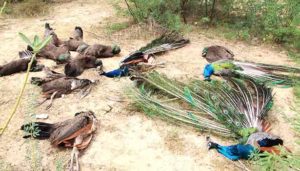 பறவை இனங்களுக்காக சிலர் நெல் உள்ளிட்ட உணவு தானியங்களை வழங்கி வந்தனர். இன்று காலை வழக்கம்போல் உணவு தானியம் கொடுக்க சென்ற ஒருவர் அங்கு ஏராளமான மயில்கள் இறந்து கிடப்பதை பார்த்து அதிர்ச்சி அடைந்தார்.