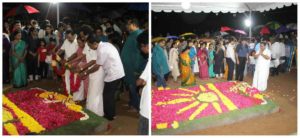 வயது மூப்பின் காரணமாக ஏற்பட்ட உடல்நலக்குறைவால் சென்னை காவேரி மருத்துவமனையில் அனுமதிக்கப்பட்டிருந்த தி.மு.க கருணாநிதி, நேற்று முன்தினம் மாலை உயிரிழந்தார். பின்னர் சென்னை ராஜாஜி ஹாலில் வைக்கப்பட்டிருந்த கருணாநிதியின் உடலுக்கு அரசியல் மற்றும் திரைப் பிரபலங்கள் மட்டுமல்லாது, லட்சக்கணக்கான பொதுமக்களும் நேரில் அஞ்சலிசெலுத்தினர். இதனையடுத்து சென்னை மெரினா கடற்கரையில் உள்ள அண்ணா சமாதி அருகே கருணாநிதியின் உடல், ராணுவ மரியாதையுடன் நல்லடக்கம் செய்யப்பட்டது. மெரினாவில் அமைக்கப்பட்டுள்ள அவரது நினைவிடத்துக்குச் சென்று பிரபலங்களும், பொதுமக்களும் அஞ்சலி செலுத்தி வருகின்றனர். இதேபோல் இன்று காலை மு.க. ஸ்டாலின் உட்பட கட்சி நிர்வாகிகள் நேரில் சென்று அஞ்சலி செலுத்தினர்.