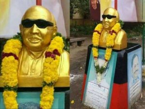 இந்நிலையில் வேலூர் மாவட்டம், குடியாத்தம் பகுதியைச் சேர்ந்த தி.மு.க மாவட்டப் பிரதிநிதி கிருஷ்ணமூர்த்தி என்பவர் மறைந்த தி.மு.க தலைவர் கருணாநிதிக்கு முதன்முதலாகக் குடியாத்தம் பாலிடெக்னிக் கூட்டுசாலை பேருந்து நிறுத்தத்தில் உள்ள தி.மு.க கொடி கம்பத்தின் கீழ் கருணாநிதி உருவ சிலையை நிறுவியுள்ளார். தகவல் அறிந்து சம்பவ இடத்துக்கு வந்த வருவாய்த்துறையினர் மற்றும் காவல்துறையினர் அனுமதியின்றி சிலை வைக்கக் கூடாது எனக் கூறி சிலையை அகற்றினர்.