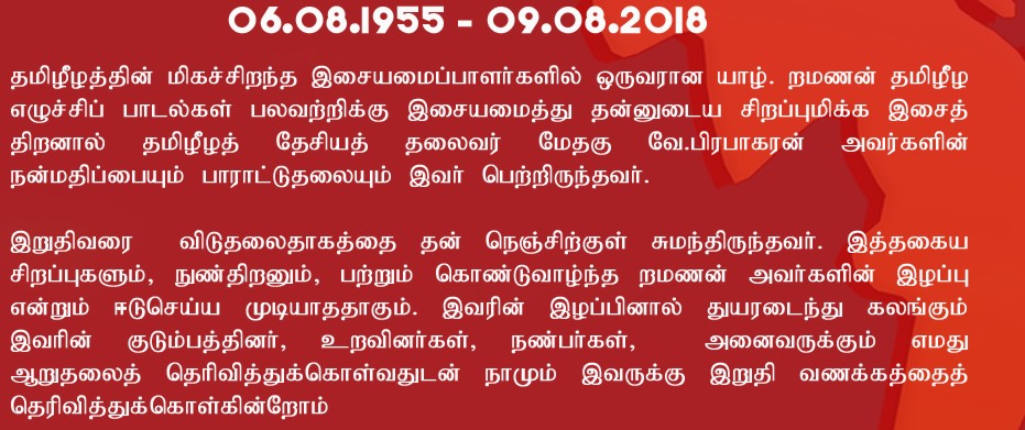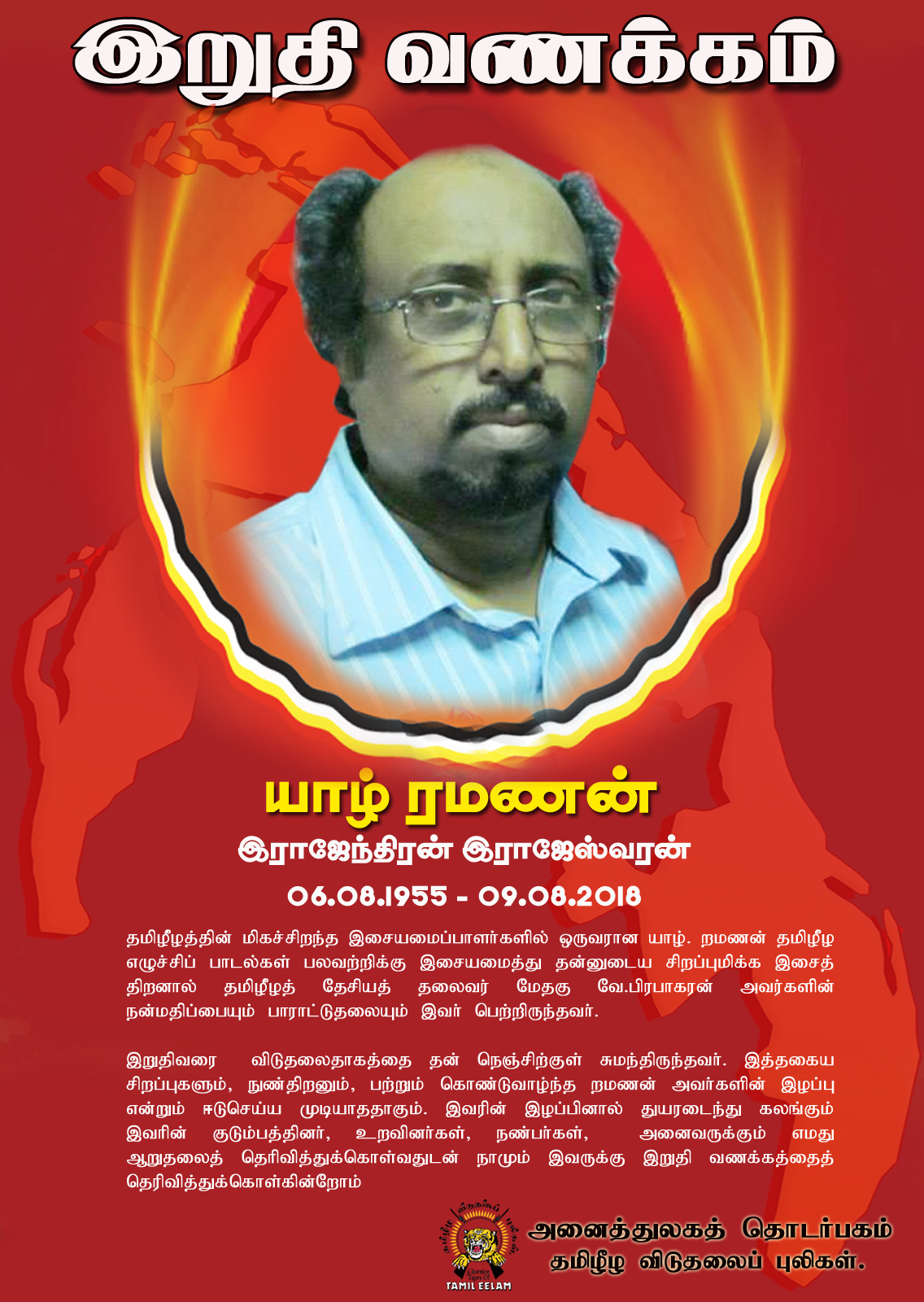 தமிழீழத்தின் மிகச்சிறந்த இசையமைப்பாளர்களில் ஒருவரான யாழ். றமணன் என எல்லோராலும் அழைக்கப்படும் இராஜேந்திரன் இராஜேஸ்வரன் அவர்களின் மறைவு எம்மை மிளாத்துயரில் ஆழ்த்தியுள்ளது.