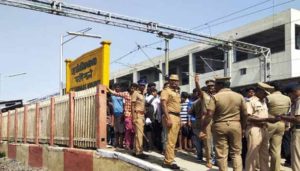 ரெயில் நிலையத்தில் ரெயில் நிற்பதற்காக வேகம் குறைக்கப்பட்டு நிறுத்தப்பட்டது. பயணிகள் ரெயில் பெட்டிக்கு வெளியே தொங்கிக் கொண்டு பயணம் செய்த காரணத்தால், இரண்டு ரெயில் பாதைகளுக்கு நடுவே அமைக்கப்பட்டிருந்த தடுப்புச் சுவரில் மோத வேண்டிய நிலை ஏற்பட்டது.