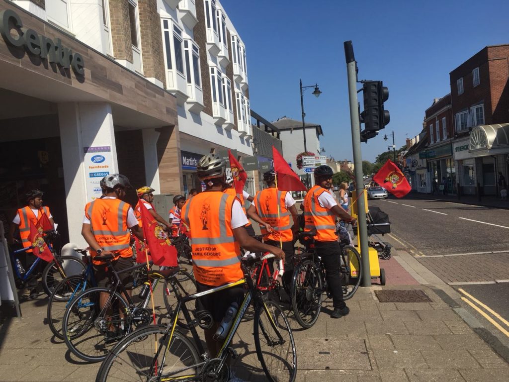 ஈழத்தமிழர்களின் இன அழிப்புக்கு நீதி கோரி கடந்த 2 நாட்களாக நடைபெறும் ஐநா நோக்கிய நீதிக்கான ஈருருளிப்பயணம் நேற்றைய தினம் மாலை நேரம் Harwich துறைமுகத்தை சென்றடைந்தது. அங்கிருந்து கப்பல் ஊடாக இன்று காலை நெதர்லாந்து Den Haag துறைமுகத்தை சென்றடைய உள்ளது. நேற்றைய பயணத்தில் தமிழின அழிப்பை எடுத்துரைக்கும் துண்டுப்பிரசுரங்கள் விநியோகிக்கப்பட்டதோடு தமிழின அழிப்பை எடுத்துரைக்கும் கண்காட்சிப்படங்களையும் கவனயீர்ப்பு நிகழ்வுகளில் தாங்கியவண்ணம் மனிதவுரிமை செயற்பாட்டாளர்கள் ஈடுபட்டனர்.