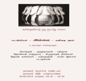 கவிதைகளோடு 30.09.2018 ஞாயிறு மாலையில் நிலாந்தன், அருந்தாகரன், ரதிதரன், ஜோன்சன் ராஜ்குமார், கருதர்ஷன் நிக்லஸ், ஜோன் கலிஸ்ரஸ், மதி ஷாழினி, சப்னா இக்பால் ஆகியோர் கலந்துகொள்ளுகிறார்கள்