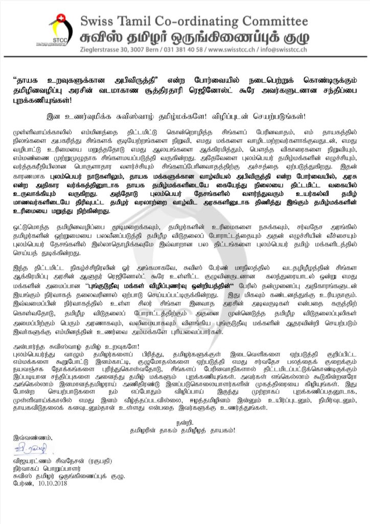 புலம்பெயர்ந்து வாழும் தமிழர்களைப் பிரித்து, தமிழர்களுக்குள் இடைவெளிகளை ஏற்படுத்தி குறிப்பிட்ட எம்மக்களை கூறுபோட்டு இனம்காட்டி, குழுமோதல்களை ஏற்படுத்தி எமது சர்வதேச பலத்தைக் குறைக்கும் நயவஞ்சக நோக்கங்களை புரிந்துகொள்வதோடு, சிங்களப் பேரினவாதிகளால் திட்டமிடப்பட்டுக்கொண்டிருக்கும் இப்படியான சந்திப்புகளை அனைத்து தமிழ் மக்களும் புறக்கணியுங்கள். அவர்கள் எங்கெல்லாம் கூடுகின்றனரோ அங்கெல்லாம் இனமானத்தமிழராய் அணிதிரண்டு இனப்படுகொலையாளர்களின் முகத்திரையை கிழியுங்கள். இது போன்ற செயற்பாடுகளை நம் எப்போதும் விழிப்பாய் இருந்து முற்றாகப் புறக்கணிப்பதனூடாக, முள்ளிவாய்க்காலில் எமது இனம் வீழ்த்தப்படவில்லை ஈழத்தமிழினம் இன்னும் உயிர்ப்புடனும், நிமிர்வுடனும், தாயகவிடுதலைக் கனவுடனும்தான் உள்ளது என்பதை இவர்களுக்கு உணர்த்துங்கள்.