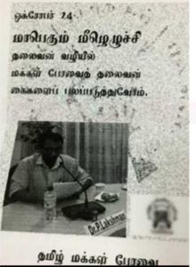 தலைவர் வழியில் மாபெரும் மீளெழுச்சி என்று தலைப்பிடப்பட்டு அந்த துண்டுப் பிரசுரம் யாழ். நகரின் பல்வேறு இடங்களில் விநியோகிக்கப்பட்டுள்ளது.