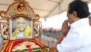 முன்னதாக கருணாநிதி மறைந்து 100-வது நாளையொட்டி அவரது சமாதி பூக்களால் அலங்கரிக்கப்பட்டிருந்தது. சமாதியின் மீது தனது தாயார் அஞ்சுகம் அம்மையாருடன் கருணாநிதி இருப்பது போன்ற ஓவியம் பூக்களால் உருவாக்கப்பட்டிருந்தது.