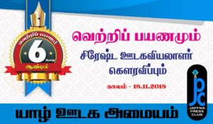 யாழ்.ஊடக அமையத்தின் 6 ஆம் ஆண்டு நிறைவு விழாவும், சிரேஸ்ர ஊடகவியலாளர்களை கௌரவிக்கும் நிகழ்வும் எதிர்வரும் 18 ஆம் திகதி ஞாயிற்றுக் கிழமை மாலை 5 மணிக்கு யூ.எஸ் விருந்தினர் விடுதி மண்டபத்தில் நடைபெறவுள்ளது.