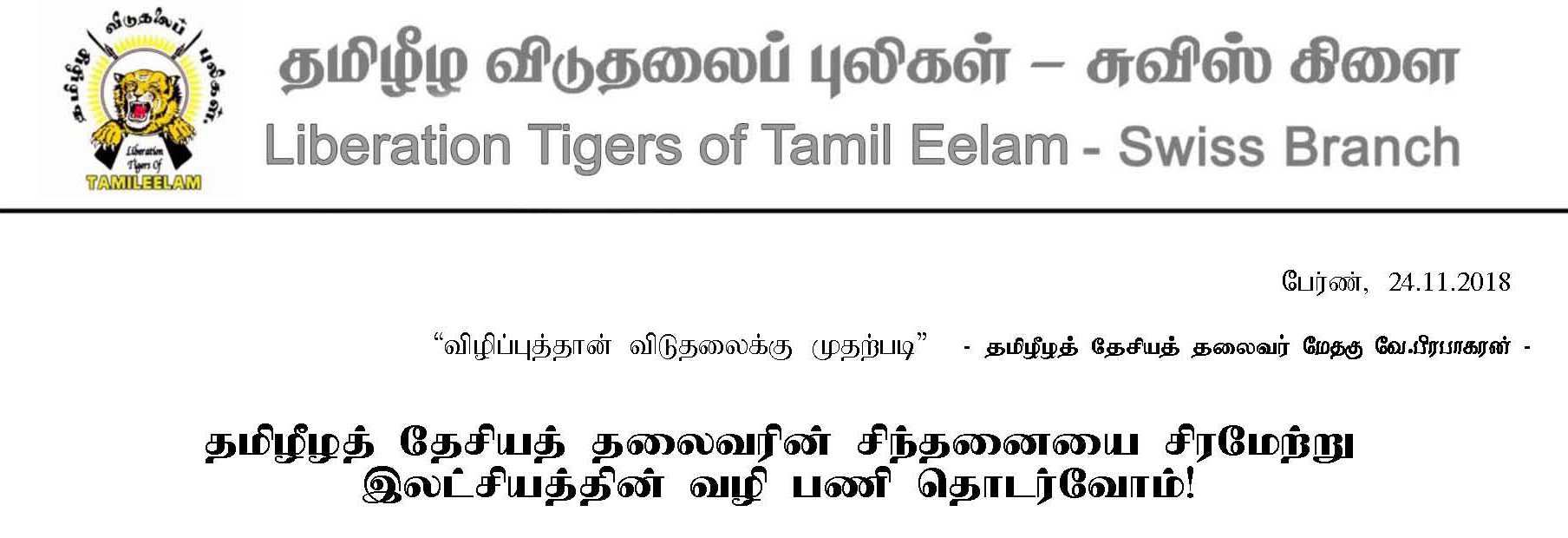 எமது போராட்டம் அறத்தின் வழி; முன்னெடுக்கப்பட்டது. நெறிதவறாமல் நேர்மையுடன் வழிநடாத்தப்பட்டவர்கள் நாம். இந்த நாட்டு சட்ட வரைமுறைமைக்கு அமைவாகவே எமது செயற்பாடுகள் அமையப்பெற்றுள்ளன. ஈழத்தமிழருக்கு சுதந்திரத் தமிழீழம் ஒன்றே இறுதித்தீர்வு என்ற இலக்;கில் தமிழீழ விடுதலைப்புலிகள் சுவிஸ்கிளையானது எந்த சமரசத்தையும் செய்ய மாட்டாது என்பதோடு எந்த தருணத்திலும் எப்படியான இடர்கள் சூழ்ந்தாலும் தமிழீழ விடுதலை என்ற இலக்கில் இருந்து வழுவிச்செல்லாது இறுதி இலக்கை அடையும் வரை நம்பிக்கையோடும் உறுதியோடும் எமது உரிமைப்போராட்டத்தினை வென்றெடுக்க நாம் தொடர்ந்தும் போராடுவோம் என்றும் உறுதி கூறுகின்றோம்.