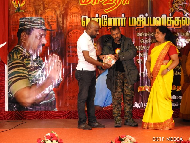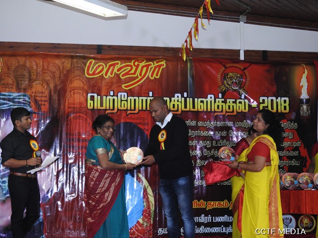 மதியபோசனத்தைத் தொடர்ந்து, மாவீரர் பெற்றோர் மற்றும் சகோதரர் மேடையில் நினைவுக் கேடயம் வழங்கி மதிப்பளிப்புச் செய்யப்பட்டனர்.சிறப்புரையை பிரான்சு தமிழர் ஒருங்கிணைப்புக்குழு பரப்புரைப் பொறுப்பாளர் திரு.மேத்தா அவர்கள் ஆற்றியிருந்தார்.அவர் தனது உரையில், இன்று மாவீரர்களின் தியாகத்தையும் மாவீரர் பெற்றோரின் கருத்துக்களையும் பகிர்ந்துகொண்டார்.