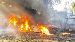 தகவல் அறிந்து வந்த போலீசார், அவர்களை சமாதானப்படுத்த முயன்றனர். அப்போது, ஒரு கும்பல், போலீசாரை நோக்கி கற்களை வீசியது. அருகில் இருந்த புறக்காவல் நிலையத்துக்கும், வாகனங்களுக்கும் தீவைத்தது.