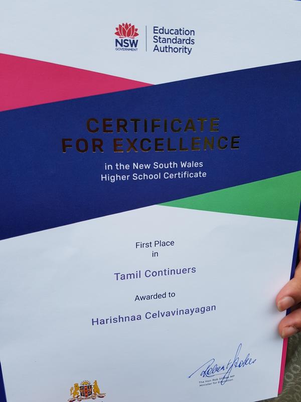 அவுஸ்திரேலியாவின் நியூ சவுத்வேல்ஸ் மாநிலத்தில் உயர்தர பரீட்சைக்கு தமிழ் மொழியை ஒரு பாடமாக எடுத்து மாநிலத்தில் முதல் மாணவனாக 95புள்ளிகளை செல்வன் ஹரிஷ்ணா செல்வவிநாயகன் அவர்களும், இரண்டாம் இடத்தை 94புள்ளிகள் பெற்று செல்வி ப்ரீத்தி சக்தி சிவபாலன் அவர்களும் எடுத்துள்ளனர். யாழ்ப்பாணம் வல்வெட்டித்துறையைச் சேர்ந்த செல்வவிநாயகன், பத்மினி தம்பதிகளின் சிரேஷ்ட புதல்வனான ஹரிஷ்ணா அவர்கள் அவுஸ்திரேலியாவில் பிறந்து வளர்ந்தவர் என்பது குறிப்பிடத்தக்கது. வென்ற்வேர்த்வில் தமிழ் பாடசாலையில் தமிழ் மொழியை கற்ற இவர் கலைகளிலும் மிகுந்த ஆர்வமுள்ள மாணவனாகும்.