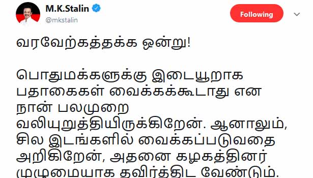 பேனருக்கு தடை வரவேற்கத்தக்க ஒன்று. பொது மக்களுக்கு இடையூறாக பதாகைகள் வைக்கக் கூடாது என நான் பலமுறை வலியுறுத்தி இருக்கிறேன்.