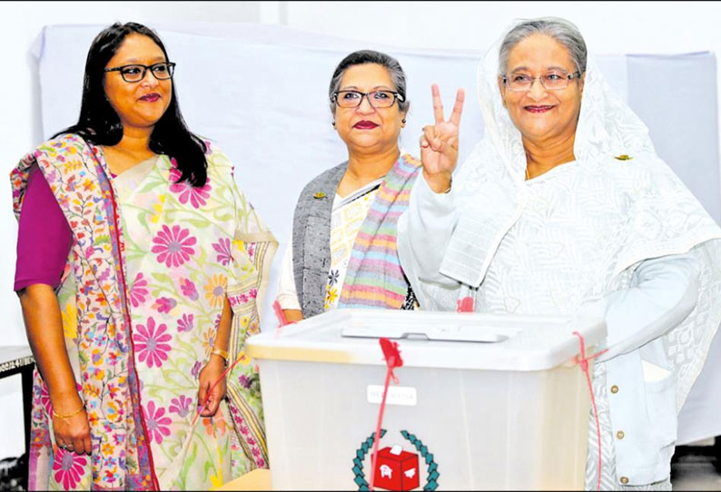 டாக்காவில் அமைக்கப்பட்டிருந்த வாக்குச்சாவடியில் பிரதமர் ஷேக் ஹசினா, முதல் வாக்காளராக வந்து ஓட்டுப்பதிவு செய்தார்.