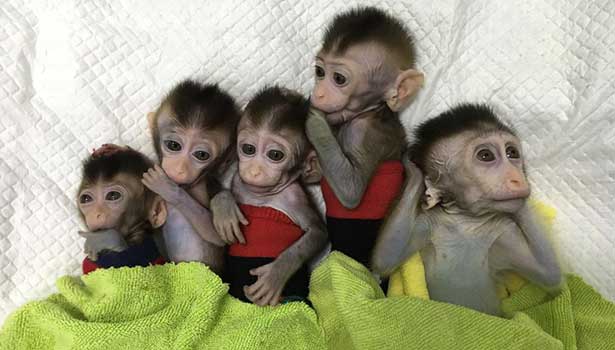 மரபணு திருத்தப்பட்ட 5 குரங்குகளை குளோனிங் முறையில் சீன விஞ்ஞானிகள் உருவாக்கியுள்ளனர். இவை மூலம் மனிதர்களுக்கு ஏற்படும் தூக்கமின்மை பிரச்சனை, மறதி நோய் உள்ளிட்ட நோய்களை தடுக்க ஆய்வு மேற்கொள்ளப்படும்.