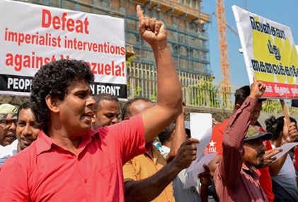 தென்னமெரிக்க நாடான வெனிசுலாவில் ஏற்பட்டிருக்கும் அரசியல் நெருக்கடியில் அமெரிக்கா தலையிடுவதைக்கண்டித்து கொழும்பில் உள்ள அமெரிக்க தூதரகத்திற்கு முன்பாக இன்று வெள்ளிக்கிழமை மக்கள் விடுதலை முன்னணியினர் ஆர்ப்பாட்டத்தில் ஈடுபட்டனர்.