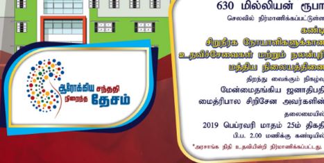‘சிறுநீரக நோயினை நாட்டிலிருந்து ஒழித்திடுவோம்’ என்ற திட்டத்தின் கீழ் நிர்மாணிக்கப்பட்டுள்ள இந்த நலன்புரி மத்திய நிலையமானது தேசிய சிறுநீரக நிதியத்தின் 630 மில்லியன் ரூபா செலவில் நிர்மாணிக்கப்பட்டுள்ளது.