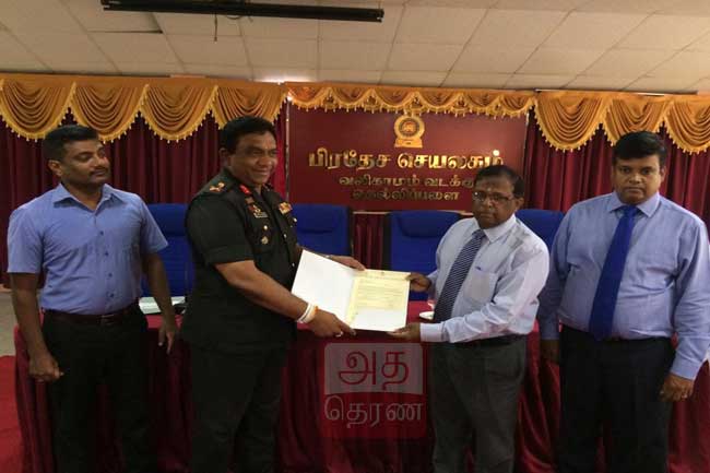 படையினர் வசமிருந்த காணிகளை விடுவிக்கும் நிகழ்வு தெல்லிப்பழை பிரதேச செயலகத்தில் இன்று நடைபெற்ற போது யாழ் மாவட்ட இராணுவத் தளபதி தர்சன கெட்டியாராச்சி விடுவிக்கப்பட்ட காணிக்கான பத்திரத்தை யாழ். மாவட்ட அரசாங்க அதிபர் என். வேதநாயகத்திடம் கையளித்தார்.