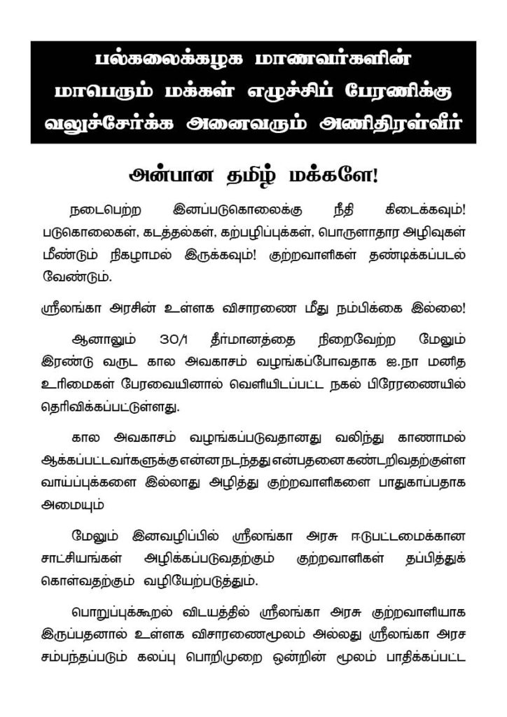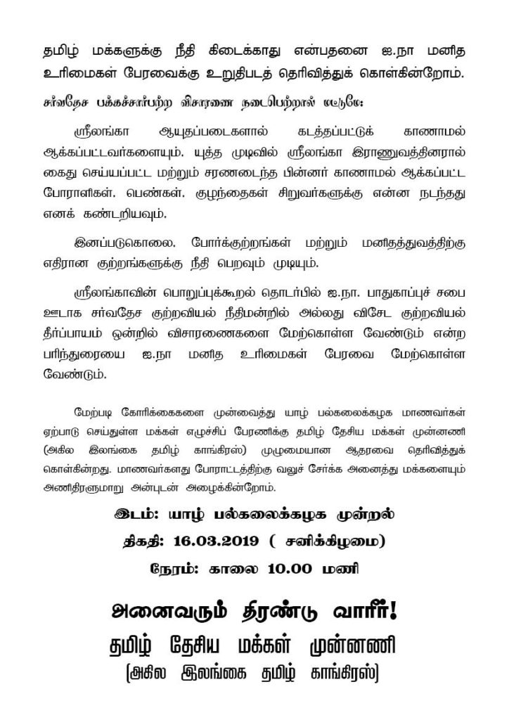 தமிழீழம் பல்கலைக்கழக மாணவர்களின் பேரணிக்கு வலுச்சேர்க்க அணிதிரள்வீர்- TNPF Posted on March 12, 2019 at March 12, 2019 by சிறி 1129 0