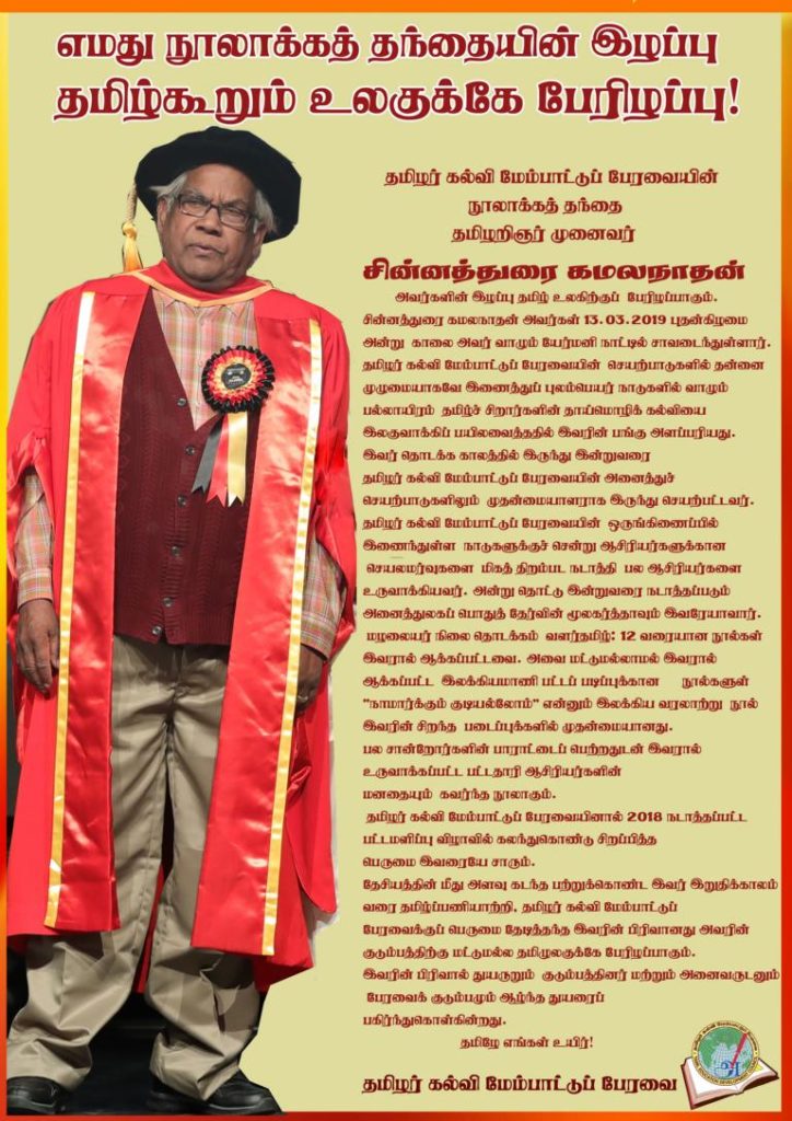 நூலாக்கத் தந்தையின் இழப்புக்கு தமிழர் கல்வி மேம்பாட்டுப் பேரவை தனது துயரைப் பகிர்கின்றது! தமிழறிஞர் முனைவர் தமிழர் கல்வி மேம்பாட்டுப் பேரவையின் நூலாக்கத் தந்தை சின்னத்துரை கமலநாதன் அவர்களின் இழப்பு தமிழ் உலகிற்குப் பேரிழப்பாகும். திரு கமலநாதன் அவர்கள் 13.03.2019 புதன் அன்று காலை அவர்வாழும் யேர்மனி நாட்டில் சாவடைந்துள்ளார்.