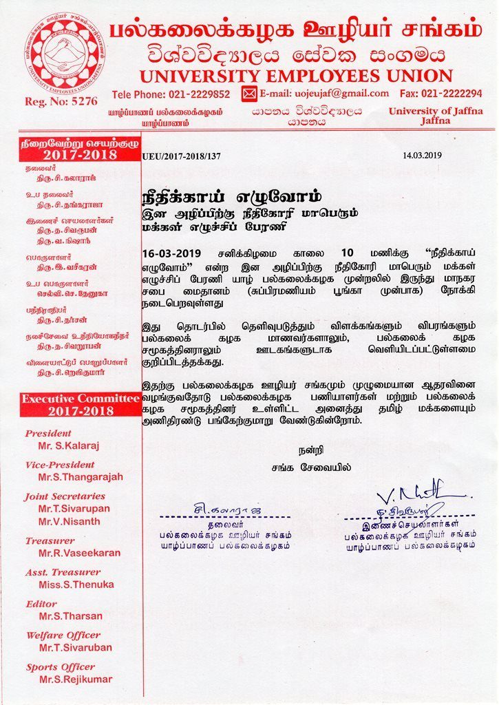 16-03-2019 சனிக்கிழமை காலை 10 மணிக்கு ”நீதிக்காய் எழுவோம்” என்ற இன அழிப்பிற்கு நீதிகோரி மாபெரும் மக்கள் எழுச்சிப் பேரணி யாழ் பல்கலைக்கழக முன்றலில் இருந்து மாநகர சபை மைதானம் (சுப்பிரமணியம் பூங்கா முன்பாக) நோக்கி நடைபெறவுள்ளது.