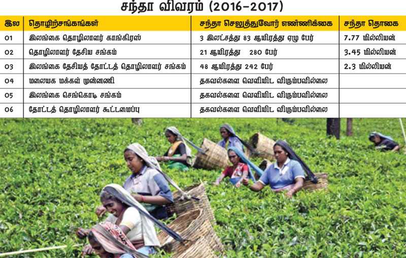 மலையகத் மய்யமாகக் கொண்டு இயங்கிவரும் தொழிற்சங்கங்கள், தோட்டத் தொழிலாளர்களிடமிருந்து மில்லியன் கணக்கான ரூபாய்களை சந்தாவாகப் பெற்றுக்கொள்வது தொடர்பான விவரம் வெளியாகியுள்ளது.