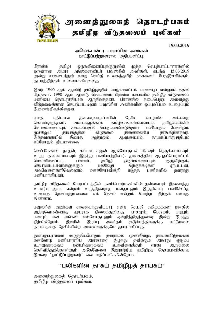 பிரான்சு தமிழர் ஒருங்கிணைப்புக்குழுவின் மூத்த செயற்பாட்டாளர்களில்ஒருவரான அமரர் அலெக்சாண்டர் பவுஸ்ரின் அவர்கள், கடந்த 15.03.2019அன்று சாவடைந்தார் என்ற செய்தி உலகத்தமிழ் மக்களைப் பேரதிர்ச்சிக்கும்,துயரத்திற்கும் உள்ளாக்கியுள்ளது.இவர் 1966 ஆம் ஆண்டு தமிழீழத்தின் யாழ்மாவட்டம் பாசையூர் என்னுமிடத்தில்பிறந்தார். 1990 ஆம் ஆண்டு தொடக்கம் பிரான்சு மண்ணில் தமிழீழ விடுதலைப்பணியை தொடர்ச்சியாக ஆற்றிவந்தவர். பிரான்சில் நடைபெற்ற அனைத்துவிடுதலைக்கான செயற்பாட்டிலும் பவுஸ்ரின் அவர்களின் ஒப்புவிப்பும் உழைப்பும்இணைந்திருக்கின்றன.எமது எதிர்கால தலைமுறையினரின் நேரிய வாழ்வில் அக்கறைகொண்டிருந்தவர். அவர்களுக்காக தமிழ்ச்சங்கங்களையும், தமிழ்க்கல்விச்சோலைகளையும் அமைப்பதில் பெரும்பங்கெடுத்தவர். எப்போதும் பேச்சிலும்மூச்சிலும் தாயகத்தின் விடுதலை நினைவையே தாங்கிநின்றவர்.இந்தவகையில் இவரது ஆற்றலும், ஆளுமையும், தாயகப்பற்றுறுதியும்எப்போதும் திடமானவை.லெப்.கேணல் நாதன், கப்டன் கஜன் ஆகியோருடன் மிகவும் நெருக்கமாகவும்உற்ற துணையாகவும் இருந்து பணியாற்றினார். தாயகத்தில் ஆயுதப்போராட்டம்மௌனிக்கப்பட்ட பின்னர், தமிழர் ஒருங்கிணைப்புக் குழுவிற்கும்,செயற்பாட்டாளர்களுக்கும் பல்வேறு நெருக்கடிகள் ஏற்பட்டன.அவ்வேளைகளிலெல்லாம் மனச்சோர்வின்றி எடுத்த பணிகளில் தளராதுபணியாற்றியவர்.தமிழீழ விடுதலைப் போராட்டத்தில் புலம்பெயர்மண்ணில் தன்னையும் இணைத்துஉணர்வுடனும், என்றும் உறுதிதளராத மனதுடனும் இறுதிவரை பணிசெய்தஉன்னத தேசப்பற்றாளனை எம் தேசம் என்றும் போற்றி நிற்கும் என்பதுதிண்ணம்.பவுஸ்ரின் அவர்கள் சாவடைந்துவிட்டார் என்ற செய்தி தமிழ்மக்கள் மனதில்ஆற்றவொண்ணாத் துயராக நிலைத்துள்ளது. பாசமும், நேசமும், பற்றும்,பண்பும் என எங்கள் எல்லோருடனும் ஒன்றித்திருந்தவரை இன்று இழந்துநிற்கின்றோம். இவரின் இழப்பு அவர்தம் குடும்பத்தினருக்கு மட்டுமல்லதாயகத்தை நேசிக்கின்ற அனைவருக்குமே துயரமளிப்பது.துன்பதுயரங்கள் வருத்தியபோதும் தளராமல் முன்னின்று, தாயகவிடுதலைக்கனவோடு பணியாற்றிய அன்னாரை இழந்து தவிக்கும் அவரது குடும்பஉறவுகளுக்கும் நண்பர்களுக்கும் உறவினருக்கும் எமது ஆறுதலைதெரிவித்துக்கொள்ளும் அதேவேளை இவராற்றிய தமிழீழத் தேசப்பணிக்காகஇவரை ‘நாட்டுப்பற்றாளர்|| என மதிப்பளிக்கின்றோம்.