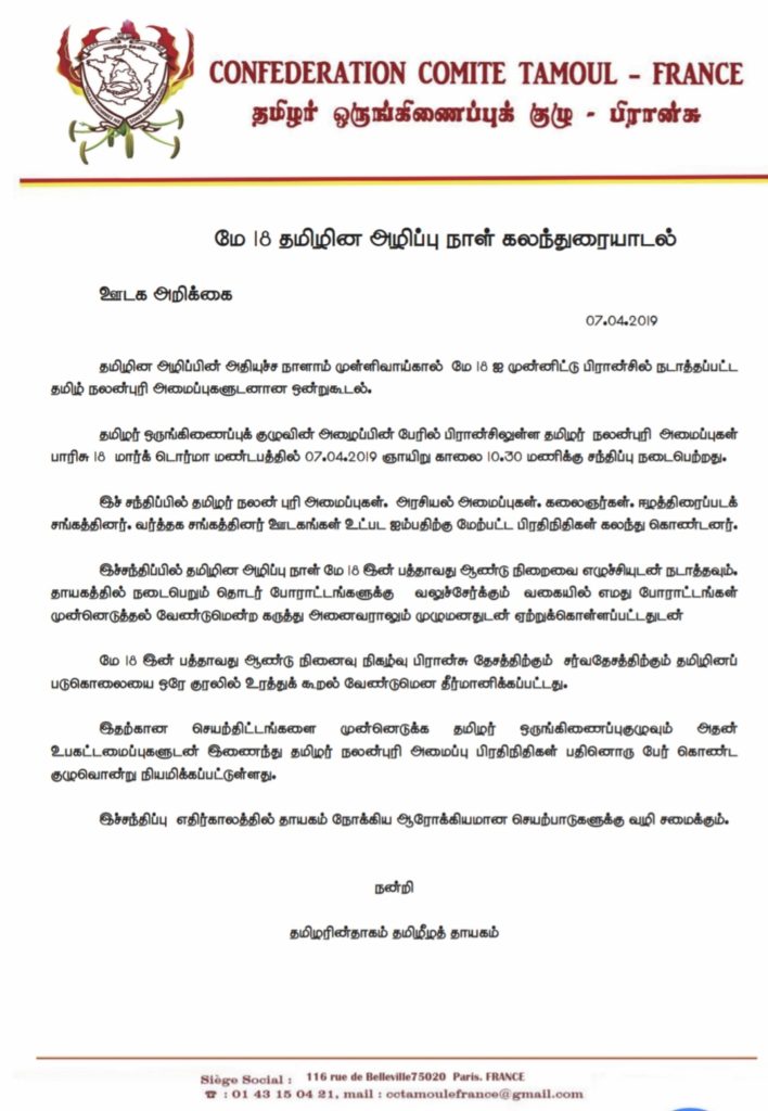 தமிழின அழிப்பின் அதியுச்ச நாளாம் முள்ளிவாய்கால் மே 18 ஐ முன்னிட்டு பிரான்சில் நடாத்தப்பட்டதமிழ் நலன்புரி அமைப்புகளுடனான ஒன்றுகூடல்.தமிழர் ஒருங்கிணைப்புக் குழுவின் அழைப்பின் பேரில் பிரான்சிலுள்ள தமிழர் நலனபுரி அமைப்புகள்பாரிசு 18 மார்க்ஸ் டொர்மா மண்டபத்தில் நேற்று 07.04.2019 ஞாயிறு காலை 10.30 மணிக்கு சந்திப்பு நடைபெற்றது.ஆரம்ப நிகழ்வாக தாய்த்தமிழகத்தில் சாவடைந்த இனமான இயக்குநர் மகேந்திரன் அவர்களுக்கு வணக்கம் செலுத்தப்பட்டது.இச்சந்திப்பில் தமிழர் நலன்புரி அமைப்புகள், அரசியல் அமைப்புகள், கலைஞர்கள், ஈழத்திரைப்படச்சங்கத்தினர், வர்த்தக சங்கத்தினர் ஊடகங்கள் உட்பட ஐம்பதிற்கு மேற்பட்ட பிரதிநிதிகள் கலந்து கொண்டனர்.இச்சந்திப்பில் தமிழின அழிப்பு நாள் மே 18 இன் பத்தாவது ஆண்டு நிறைவை எழுச்சியுடன் நடாத்தவும்,தாயகத்தில் நடைபெறும் தொடர் போராட்டங்களுக்கு வலுச்சேர்க்கும் வகையில் எமது போராட்டங்கள்முன்னெடுத்தல் வேண்டுமென்ற கருத்து அனைவராலும் முழுமனதுடன் ஏற்றுக்கொள்ளப்பட்டதுடன்மே 18 இன் பத்தாவது ஆண்டு நினைவு நிகழ்வு பிரான்சு தேசத்திற்கும் சர்வதேசத்திற்கும் தமிழினப்படுகொலையை ஒரே குரலில் உரத்துக் கூறல் வேண்டுமென தீர்மானிக்கப்பட்டது.இதற்கான செயற்திட்டங்களை முன்னெடுக்க தமிழர் ஒருங்கிணைப்புக்குழுவும் அதன்உபகட்டமைப்புகளுடன் இணைந்து தமிழர் நலன்புரி அமைப்பு பிரதிநிதிகள் பதினொரு பேர் கொண்டகுழுவொன்று நியமிக்கப்பட்டுள்ளது.இச்சந்திப்பு எதிர்காலத்தில் தாயகம் நோக்கிய ஆரோக்கியமான செயற்பாடுகளுக்கு வழிசமைக்கும்.நன்றி