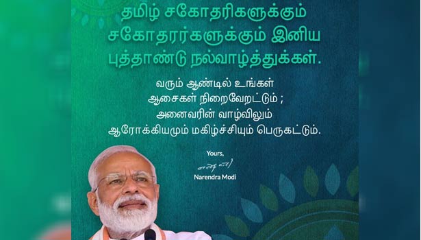 பிரதமர் நரேந்திர மோடி தனது டுவிட்டர் பக்கத்தில் வாழ்த்து மடல் வடிவில் வெளியிட்டுள்ள வாழ்த்துச் செய்தியில், ‘தமிழ் சகோதரர்களுக்கும், சகோதரிகளுக்கும் இனிய புத்தாண்டு நல்வாழ்த்துகள்! வரும் ஆண்டில் உங்கள் ஆசைகள் நிறைவேறட்டும்; அனைவரின் வாழ்விலும் ஆரோக்கியமும் மகிழ்ச்சியும் பெருகட்டும் என குறிப்பிட்டுள்ளார்.