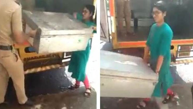 அப்போது ஒரு காவலர் மட்டும் பெட்டியை இறக்குவதற்காக வாகனத்தின் அருகில் வந்து மற்றொரு காவலருக்காக காத்திருந்தார். இதை பார்த்த அனுபமா சிறிதும் யோசிக்காமல் அந்த காவலருடன் ஒரு கை பிடித்து பெட்டியை உள்ளே கொண்டு சென்றார்.