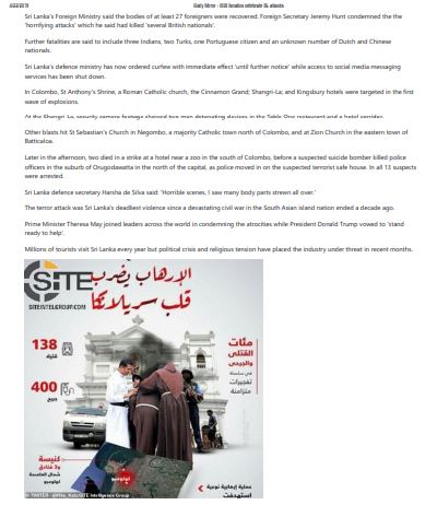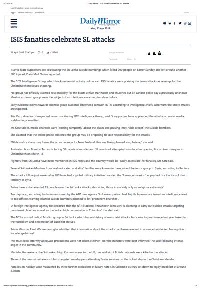 அத்துடன், பிரிட்டனைத் தளமாகக் கொண்ட டெய்லி மெயில் இணைய ஊடகம், சைட் இன்ரலிஜன்ஸ்; குறூப் என்ரப்பிறைஸ் நிறுவனத்தின் பணிப்பாளர் ரிட்டா கற்ஸ் அம்மையார், ஐ.எஸ்.ஐ.எஸ் ஆதரவாளர்கள் இலங்கைத் தாக்குதலைக் கொண்டாடி மகிழ்ந்துள்ளதாகத் தெரிவித்துள்ளார் என்று கூறியுள்ளது.