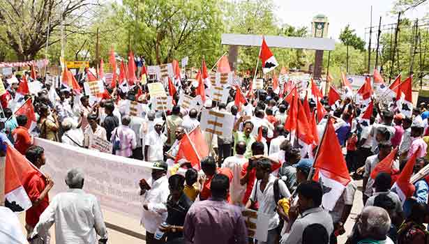 அதன்படி இன்று காலை தமிழ் தேசிய பேரியக்கத்தின் தலைவர் பெ.மணியரசன் தலைமையில் அந்த அமைப்பை சேர்ந்தவர்கள் மற்றும் பல்வேறு அமைப்புகளை சேர்ந்த பெண்கள், குழந்தைகள், தொழிலாளர்கள் என 400-க்கும் மேற்பட்டோர் பொன்மலை ரெயில்வே பணிமனை முன்பு குவிந்தனர்.