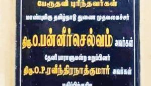 தேனி மாவட்டம் குச்சனூர் சனீஸ்வர பகவான் கோவில் அருகே சுரபிநதி செல்கிறது. இந்த நதிக்கரையில் காசி அன்னபூரணி ஆலயம் கட்டப்பட்டு வந்தது. ஆலயம் கட்டி முடித்து கும்பாபிஷேக பணிகள் நடந்த நிலையில் அதற்காக வைக்கப்பட்டுள்ள கல்வெட்டில் துணை முதல்-அமைச்சர் ஓ.பன்னீர்செல்வம் பெயர் இடம் பெற்றிருந்தது. அதற்கு கீழே தேனி பாராளுமன்ற உறுப்பினர் என்று ரவீந்திரநாத்குமார் பெயர் பொறிக்கப்பட்டு இருந்தது.