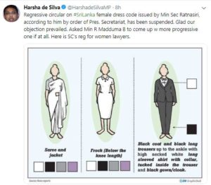 அதன் பிரகாரம் ஆண் உத்தியோகத்தர்கள் காற்சட்டை, சேர்ட் அல்லது தேசிய ஆடை என்றும் பெண் உத்தியோகத்தர்கள் சேலை அல்லது கண்டியச் சேலை (ஒசரி) மாத்திரமே அணிய வேண்டும் என தெரிவிக்கப்பட்டிருந்தது. என்றாலும் இந்த சுற்று நிருபம் தொடர்பில் நான் உட்பட பலர் தெரிவித்துவந்த எதிர்ப்பு வெற்றியளித்திருக்கின்றது.