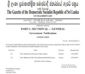 கிழக்கு மாகாண, மேல் மாகாண ஆளுநர்களான ஹிஸ்புல்லாஹ் மற்றும் அசாத் சாலி தமது பதவிகளிலிருந்து இராஜினாமா செய்துள்ள நிலையில், அவர்கள் பதவி விலகியதாக தெரிவித்து அரசாங்கத்தினால் வர்த்தமானி அறிவித்தல் வெளியிடப்பட்டுள்ளது.