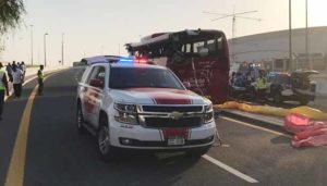 துபாய் அருகே ராஷியா என்ற பகுதியில் வந்தபோது, தடை செய்யப்பட்ட பகுதிக்குள் நுழைந்த பேருந்து விபத்தில் சிக்கியது. இந்த விபத்தில் பேருந்தில் பயணித்த 17 பேர் சம்பவ இடத்திலேயே பரிதாபமாக பலியாகினர். மேலும் 5 பேர் படுகாயம் அடைந்தனர்.
