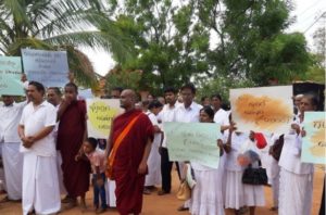 கொழும்பு, அநுராதபுரம், வெலிஓயா பகுதியிலிருந்து மூன்று பேருந்துகளில் அழைத்துவரப்பட்ட சிங்கள மக்களே இவ்வாறு ஆர்ப்பாட்டத்தில் ஈடுபட்டுள்ளனர்.