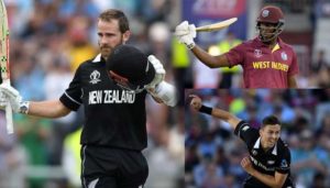 இதையடுத்து, நியூசிலாந்து அணியின் மார்டின் கப்தில், காலின் மன்ரோ தொடக்க ஆட்டக்காரர்களாக இறங்கினர். வெஸ்ட் இண்டீஸ் அணியின் ஷெல்டன் காட்ரெல் முதல் ஓவரிலேயே இருவரையும் பெவிலியனுக்கு அனுப்பி அதிர்ச்சி வைத்தியம் அளித்தார். அடுத்து இறங்கிய கேப்டன் கேன் வில்லியம்சனுடன் ராஸ் டெய்லர் ஜோடி சேர்ந்தார். இந்த ஜோடி நிதானமாகவும், பொறுப்புடனும் ஆடியது. டெய்லர் அரை சதமடித்து அசத்தினார்.
