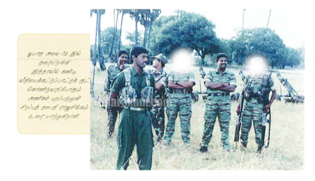 ”ஓயாத அலைகள் – 03″ இல் ஆனையிறவிற்கான சண்டைகள் முடிந்து இத்தாவிலில் நின்ற ராஜனுடன் கைகுலுக்கச் சென்ற அவன் தோழர்கள் கண்டது பழைய ராஜனையல்ல. ஆனையிறவின் வெற்றிக்காக எம் போராளிகள் வாழ்ந்த கடினவாழ்வைப் பிரதிபலித்த புதிய ராஜனைத்தான். வாடி வதங்கிய அந்த முகத்திற்கூட எவரையும் வசீகரிக்கும் அவனுக்கே உரிய கவர்ச்சிமட்டும் அப்படியே இருந்தது. நாங்கள் எப்போதும் அவனுடன் கூடவேகாணும் அந்த அழகான சிரிப்புங்கூட அப்படியேதான் இருந்தது. காய்ந்து வறண்ட அவனின் தொண்டையிலிருந்து வந்த கரகரத்த குரலிலும் எப்போதும் இருக்கும் குழைவுமட்டும் மாறாமலிருந்தது. பெரும் சாதனையைச் செய்துமுடித்ததும் தளம் வந்தவன் தலைவரைச் சந்தித்தான். தன் வீரர்கள் சாதித்தவற்றை அவருக்குத் தெரியப்படுத்தினான். தலைவருடன் தன் போராளிகளைச் சந்திக்கவைத்தான்.