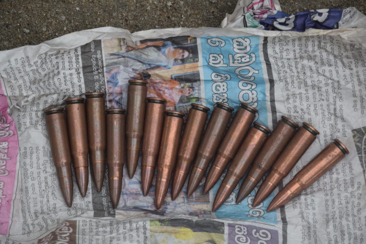 சிங்கள பத்திரிக்கை ஒன்றில் சுற்றப்பட்டடு புதைக்கப்பட்டிருந்த நிலையில் ரி-56 ரக தூப்பாக்கிக்கு பயண் படுத்தும் 14 ரவைகளை மீட்டுள்ளனர்.