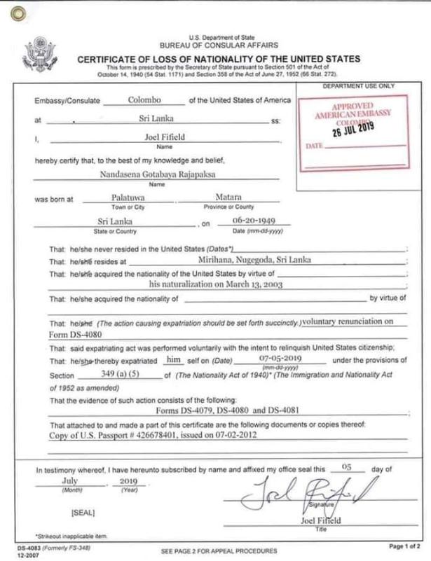 2013 மார்ச் 13 இல் அமெரிக்க பிரஜையான கோத்தபாய ராஜபக்ச 2019 யூலை ஐந்தாம் திகதி அமெரிக்க பிரஜாவுரிமையை இலங்கைக்கான அமெரி;க்க தூதரகத்தில் துறந்தார் என தெரிவிக்கப்பட்டுள்ளதுடன் அமெரிக்க அதிகாரியொருவரின் கையொப்பமும் தூதரக இலச்சினையும் காணப்படுகின்றது