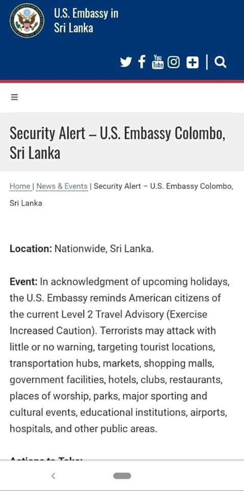 இலங்கையில் மீண்டும் தாக்குதல் நடத்தப்படலாம் என கொழும்பில் உள்ள அமெரிக்கத் தூதரகத்தின் உத்தியோகபூர்வ இணையத்தளம் நேற்றைய தினம் செய்தி வெளியிட்டிருந்ததுடன், இதன் காரணமாக இலங்கைக்கு பயணம் மேற்கொள்ளும் தமது குடிமக்களை எச்சரிக்கையுடன் இருக்குமாறும் அறிவுறுத்தியிருந்தது.