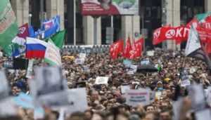 அதன்படி நேற்று முன்தினம் நடந்த அங்கீகரிக்கப்பட்ட போராட்டத்தில் சுமார் 60 ஆயிரம் பேர் திரண்டதால் மாஸ்கோ நகரத்தின் மத்திய பகுதி குலுங்கியது. போராட்டத்தின்போது அங்கு மழை பெய்தது. ஆனாலும் போராட்டக்காரர்கள் அதனை பொருட்படுத்தாமல் அரசுக்கு எதிராக கோஷங்களை எழுப்பியபடி பேரணியாக சென்றனர்.