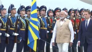 ரஷ்யா வந்த இந்திய பிரதமர் மோடிக்கு உற்சாக வரவேற்பு அளிக்கப்பட்டது. ராணுவ வீரர்கள் அணிவகுப்பு மரியாதை அளித்தனர்.
