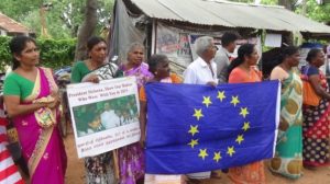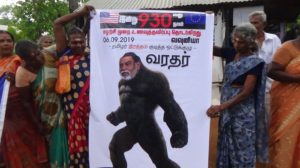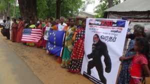 இதன்போது ஆர்ப்பாட்டக்காரர்கள் அமெரிக்க ஜரோப்பிய ஒன்றியங்களின் கொடிகளுடன் ‘தமிழர் இரத்தம் குடித்த ஒட்டுக்குழு வரதர்’ என்ற வாசகம் எழுதப்பட்ட பதாதை ஒன்றினையும் தாங்கியிருந்தனர்.