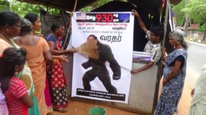 வரதராஜ பெருமாளின் முகம் பதிக்கப்பட்டு சித்திரிக்கப்பட்ட படத்தை தாங்கியவாறு விளக்குமாற்றால் அடித்து சாணத்தை கரைத்து ஊற்றியும் ஆர்ப்பாட்டத்தில் ஈடுபட்டனர்.