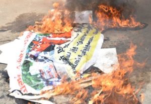ஆர்ப்பாட்டத்தில் ஈடுபட்டவர்கள் இது ஜனநாயாக ஆட்சியா, பௌத்த பேரினவாத பிக்கு ஆட்சியா, காவி உடையில் காடையர்களா, மதப்பிரச்சினையை தூண்டாதே போன்ற வாசகங்கள் அடங்கிய பதாதைகளை ஏந்தியிருந்ததுடன், கோசங்களையும் எழிப்பியிருந்தனர்.