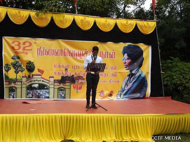 தமிழீழ மக்கள் பேரவை பொறுப்பாளர் திரு.திருச்சோதி அவர்களின் பிரெஞ்சு மற்றும் தமிழ் மொழியிலான உரை இடம்பெற்றது. அவர்தனது உரையில், 32 வருடங்களுக்கு முன்னர் தம்பி திலீபன் தமிழ் மக்கள் விடுதலை அடையவேண்டும் என்பதற்காக தனது பசியை அடக்கிக்கொண்டு, அந்த விடுதலைப் பசிக்காகத் தனது உயிரை ஈகம் செய்தான். அதைத் தொடர்ந்து பல்லாயிரக்கணக்கான மாவீரர்கள், மக்கள் அந்த விடுதலைப் பசியோடு, தமது பசியைத் தீர்க்கமுடியாத சூழலில் தமது உயிர்களை நீத்தார்கள். அந்தப் பசி இன்றும் எங்களுக்கு இருக்கின்றது. அந்த விடுதலைக்கான பசி, அதை அடையவேண்டும் என்ற அவா, தொடர்ந்து எங்களின் இரத்தத்தில் ஓடிக்கொண்டு இருக்கின்றது.