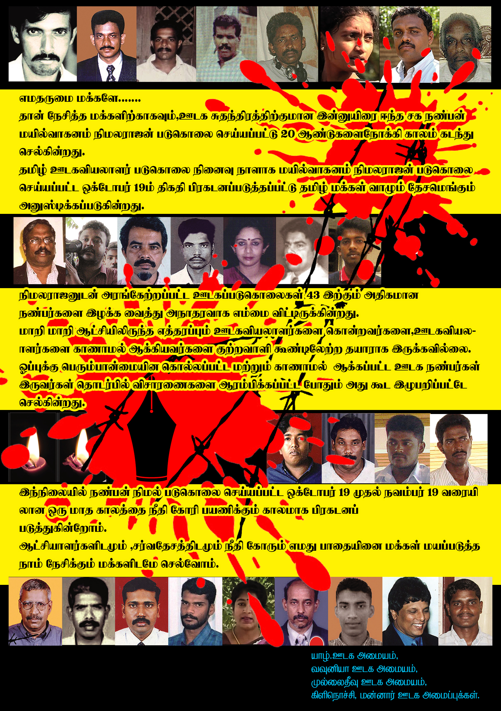அதிலும் 2000ம் ஆண்டின் ஒக்டோபர் 19ம் திகதி ஊடகவியலாளர் மயில்வாகனம் நிமலராஜன் கொலையுடன் ஆரம்பிக்கப்பட்ட தமிழ் ஊடகவியலாளர்களது கொலை கலாச்சாரம் இன்று வரை தொடர்கின்றது.